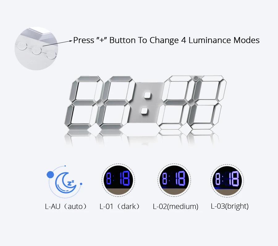 Tap “+” button → “L-SL” four levels of automatic sensitivity in sleep mode; “L-AU” three levels of automatic sensitivity; “L-01” first brightness; “L-02” second brightness; “L-03” third brightness; turn off the display.