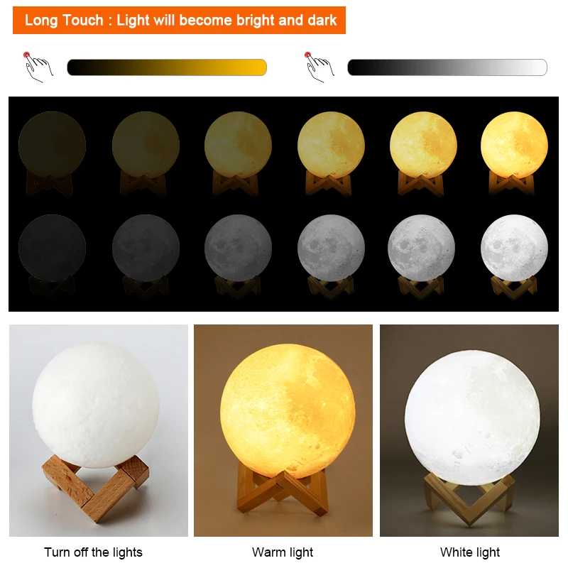 1. Touch the metal ring at the bottom of the moon lamp to turn on / off the light and change color from white to yellow.